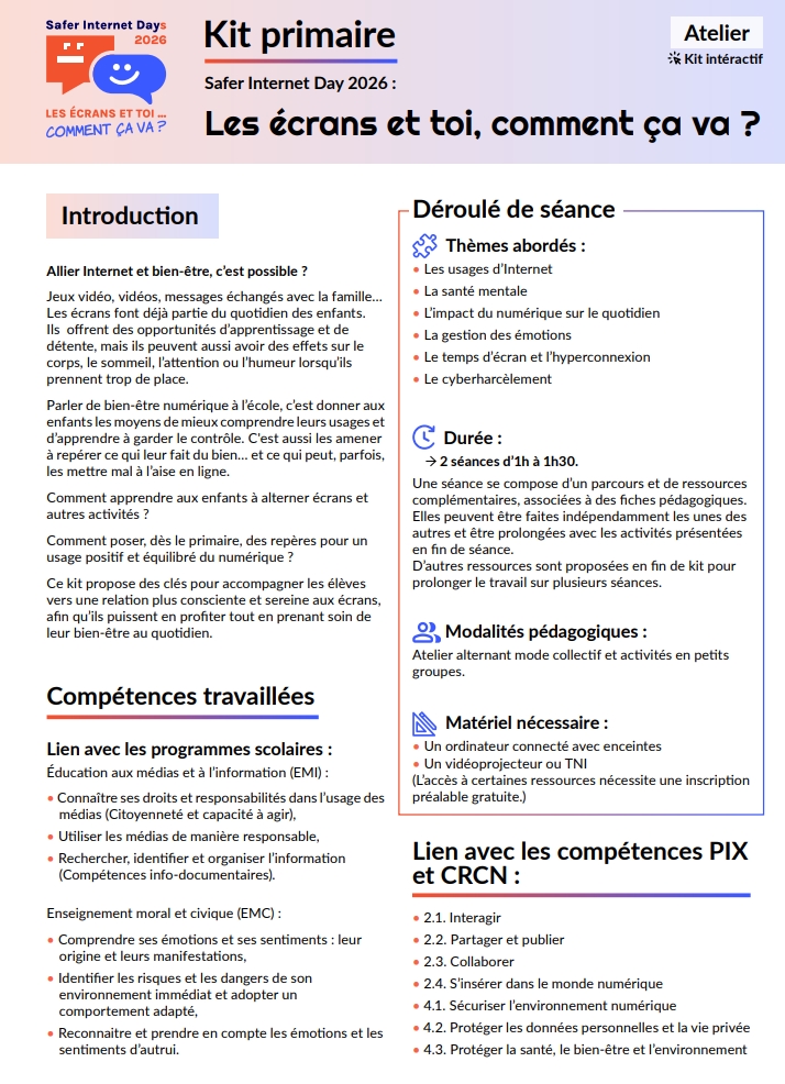 Ce kit propose des clés pour accompagner les élèves vers une relation plus consciente et sereine aux écrans, afin qu’ils puissent en profiter tout en prenant soin de leur bien-être au quotidien.