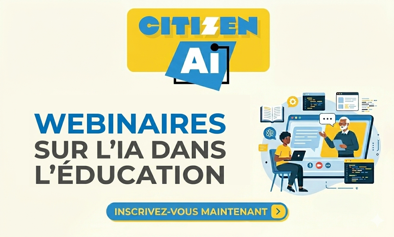 Les webinaires CitizenAI proposent en 1 heure un temps d’éclairage et d’échange autour de l’arrivée des intelligences artificielles génératives dans les pratiques scolaires.